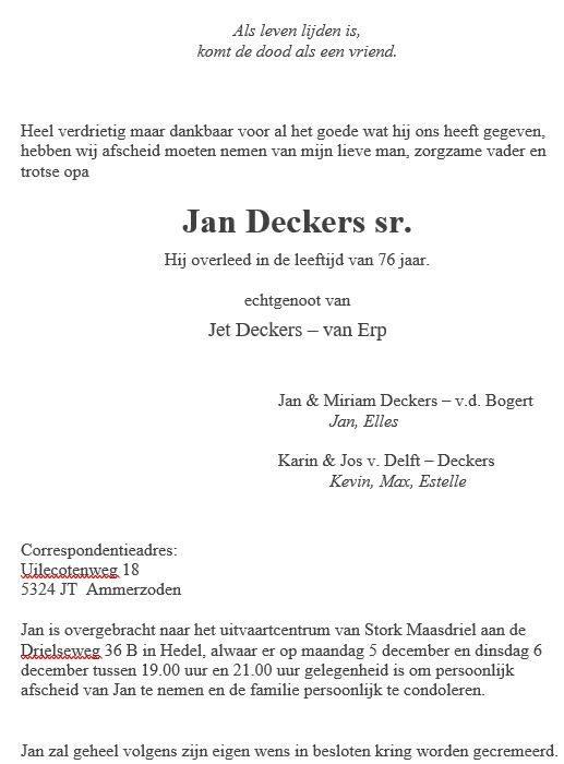 Op 1 december is Jan Deckers senior overleden. De oprichter van het transport- en AGF-bedrijf uit Ammerzoden is 76 jaar geworden. De ondernemer startte in 1970 als groothandel met het beleveren van grossiers, marktkooplieden en supermarkten. Door de jaren heen ontwikkelde Jan Deckers zich sterk op de markt als grossier. Jan Deckers sr. zag al snel dat de grossier een tijdelijke oplossing was en dat supermarkten zelf een weg zochten naar rechtstreekse inkoopkanalen in binnen- en buitenland, waarna hij zich toelegde op de transportactiviteiten, wat geresulteerd heeft in een modern transportbedrijf anno 2022. Jan stopte relatief vroeg op 50-jarige leeftijd en gaf de dagelijks leiding over aan zijn toen 20-jarige zoon Jan Deckers jr. In de tijd daarna kon Jan al volop genieten van zijn hobby’s, namelijk de pony's en duivensport.