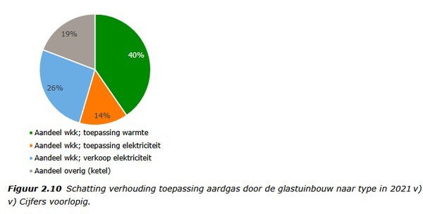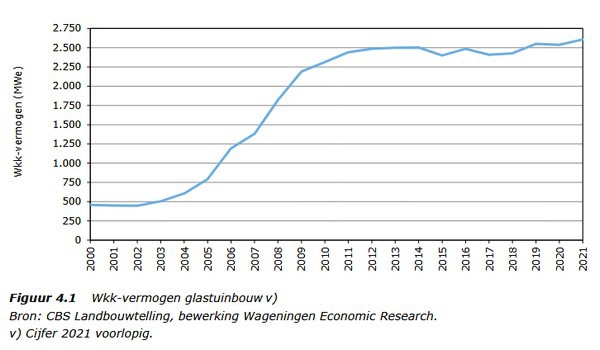 De verkoop van elektriciteit steeg met 6% naar 6,8 TWh, vooral gedreven door de gunstige sparkspread (verhouding prijs aardgas-input en prijs elektriciteit-output) waardoor een deel van de tuinders met inzet van wkk toch de kosten voor het verwarmen van hun kassen konden beheersen. Door de inzet van wkk’s in de glastuinbouw lag in 2021 de CO2-emissie van de glastuinbouw ruim 2,8 Mton hoger, maar werd er landelijk bijna 4,3 Mton CO2-emissie voorkomen.