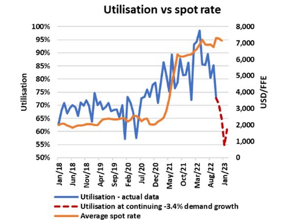 Als we het scheepsgebruik berekenen door de capaciteit en de vraag op de head-haul op elkaar af te stemmen (ervanuit gaand dat de vraag in hetzelfde tempo van -3,4% blijft dalen), en dit vervolgens vergelijken met de spotprijzen, krijgen we de gegevens in de tabel hierboven.