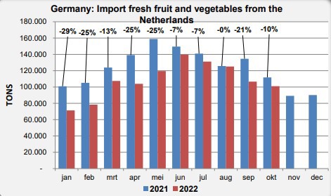 In oktober is de Duitse import van verse groenten en fruit weer fors (18%) kleiner geweest dan in oktober 2021. In de eerste 10 maanden van 2022 is de import 11% achter gebleven. Naar schatting zal de totale Duitse import van verse groenten en fruit in 2022 uitkomen op 8,3 miljoen ton. Dat is ruim 10% minder dan in 2021. Ook vergeleken met de jaren er voor werd er in 2022 veel minder ingevoerd. De waarde van import zal in 2022 met 13,5 miljard euro wel in dezelfde orde van grootte liggen als de in 2020 en 2021.