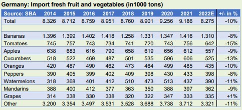 Ook de Duitse import uit de andere belangrijke leverancier Spanje zal in 2022 ver achter blijven bij die in voorgaande jaren. Volgens het Duitse Stastistisches Bundesambt is er in 2022 met 2,6 miljoen ton ruim 10% minder Spaans product in Duitsland ingevoerd dan de 2,9 miljoen ton in 2021. In 2019 en 2020 werd er zo rond de 3,0 miljoen ton Spaanse verse groenten en fruit in Duitsland ingevoerd. De import uit Italië zal in 2022 met 0,93 miljoen ton 8% achter blijven bij de 1,01 miljoen ton van 2021. Uit de dan naar omvang import volume volgende landen zal in 2022 ook minder worden ingevoerd: nl.