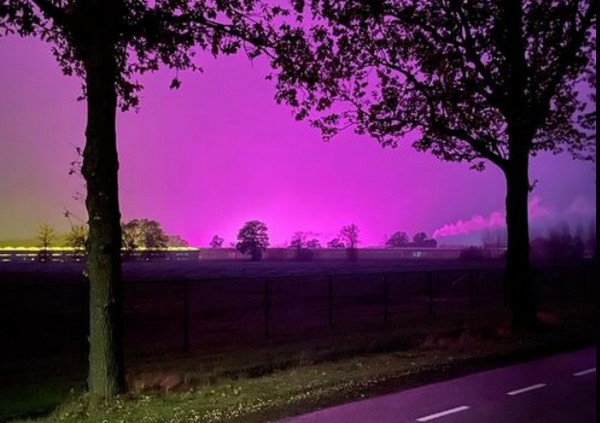 Het was een bijzonder gezicht: de lucht boven het dorp Beek en Donk in Noord-Brabant kleurde in de nacht van maandag op dinsdag fel paars. Dat kwam niet door een lichtfestival…
