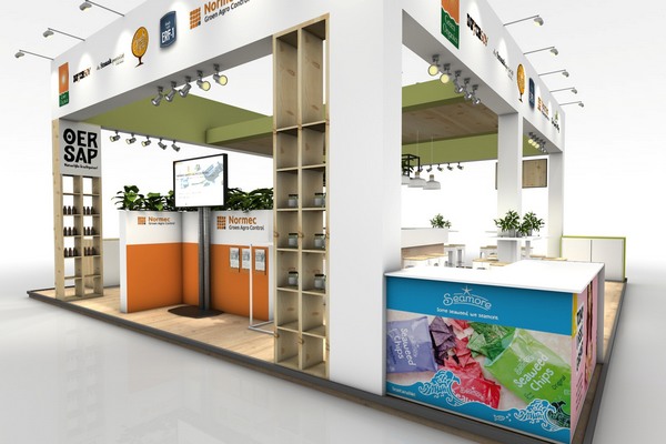 De combinatiestand op de Biobeurs zal er op deze manier uitzien. Links (met oranje) het stuk waar Normec Groen Agro Control te vinden zal zijn.