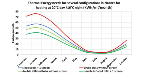 Dus werd de Hortinergy-software gebruikt om een glazen kas te vergelijken met een foliekas. Dit computerprogramma simuleert het binnenklimaat en energieverbruik van een kasproject. Er werd gebruik gemaakt van de thermische coëfficiënten van de materialen, volgens de internationale norm van kassen.
