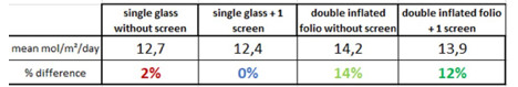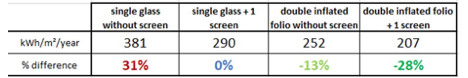 De definitieve cijfers spreken voor zich. De Hortinergy-simulatie laat zien dat de kas zonder scherm 381 kWh/m2 per jaar zou verbruiken om de kas overdag te verwarmen op 20 graden Celsius en 's nachts op 16 graden Celsius. Met een scherm zou dit dalen tot 290 kWh/m2. Een dubbel opgeblazen foliekas zou slechts 252 kWh/m2 nodig hebben om dezelfde temperatuur te bereiken over die periode. En het toevoegen van een scherm zou resulteren in een energiebehoefte van 207 kWh/m2.