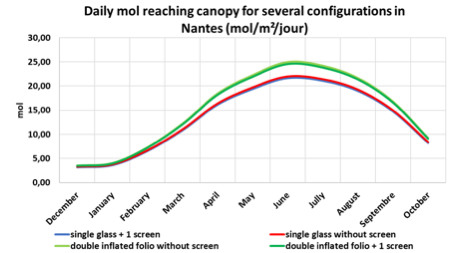 Mol die het bladerdak bereikt voor verschillende configuraties in Nantes (mol/m²/dag)