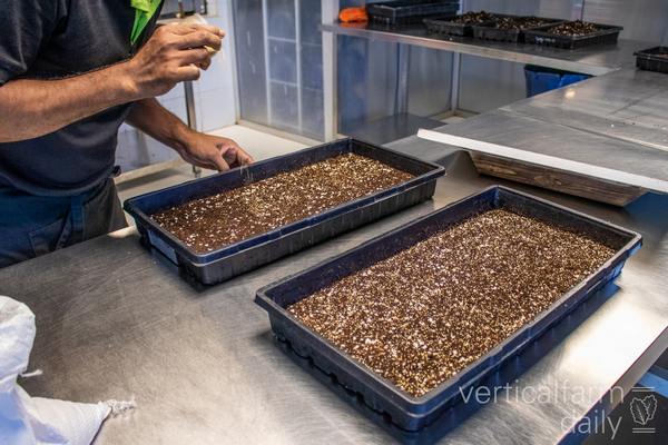 Een zelfgemaakt grondmengsel wordt in trays gedaan, waarna de zaden worden uitgestrooid.