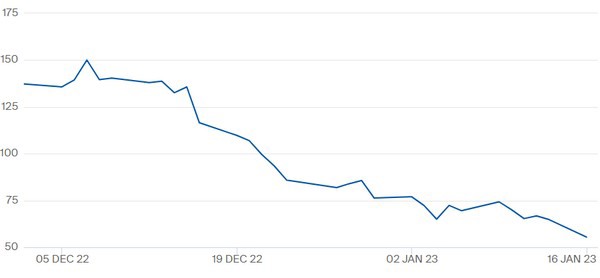 De TTF-gasprijs voor februari 2023 t/m 16 januari. Dinsdagochtend 17 januari is de gasprijs verder gedaald tot 53,1 euro per megawattuur. Vrijdag sloot de gasprijs nog af op 64 euro. Klik hier voor actuele cijfers.