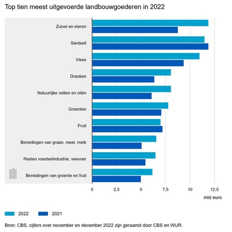 In de ranglijst van meest uitgevoerde landbouwproducten is de productgroep zuivel en eieren gestegen van drie naar één. De exportwaarde van deze productgroep is met 35 procent toegenomen; van 8,8 miljard euro in 2021 tot 11,9 miljard euro in 2022.