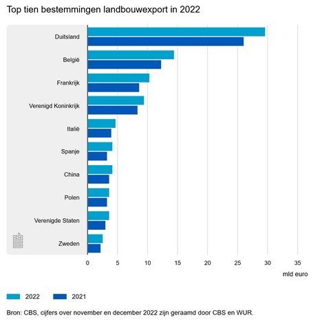 De export naar Spanje (met 25 procent) en naar de Verenigde Staten (met 24 procent) is sterk in waarde toegenomen. Daardoor is Spanje nu de zesde exportbestemming van landbouwgoederen in plaats van China. Zweden is de nieuwe nummer tien en komt op de plek van Denemarken, de nummer tien van 2021.