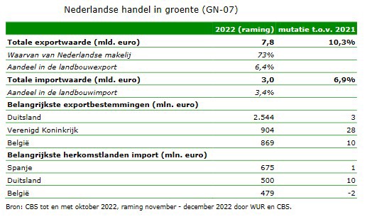 De waarde van de Nederlandse export van kas- en vollegronds-groenten, aardappelen en uien bedroeg 7,8 mld euro in 2022, ruim 10% meer dan in 2021. Tomaten, paprika’s, uien,