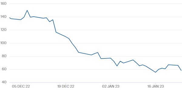 De TTF-gasprijs voor februari 2023 t/m 24 januari. Woensdagochtend bleef de gasprijs onder de 60 euro per megawattuur bewegen. Klik hier voor actuele cijfers.