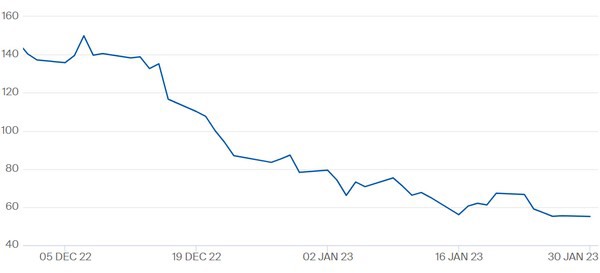 De TTF-gasprijs voor maart 2023 t/m 30 januari. Dinsdagochtend om 9.30 uur lag de gasprijs op 59,4 euro per megawattuur. Klik hier voor actuele cijfers.