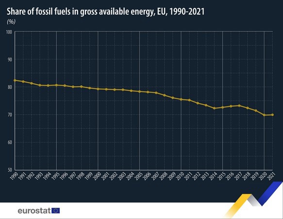 Tot slot van deze dinsdagupdate een bericht van Eurostat. De Europese statistici laten zien dat we gestaag minder fossiele brandstoffen zijn gaan gebruiken. Ten opzichte van 2020 steeg in 2021 'ons' gebruik niet.