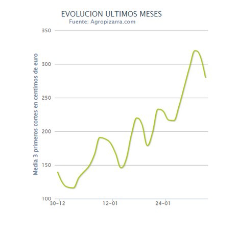 Op de diverse Spaanse veilingen is de prijsstijging duidelijk te zien. De afgelopen twee dagen zakte de prijs hier wel weer iets.