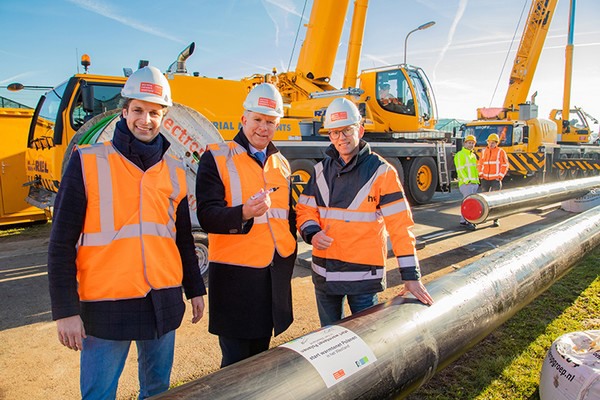 Op woensdag 8 februari is een warmteleiding van maar liefst 492 meter succesvol ingetrokken onder de kassen naar de aardwarmtelocatie van Polanen aan de Madeweg. De warmteleiding is het eerste deel van het warmtenet in Polanen. Om dit moment te markeren plaatsten wethouder Varekamp en directeur Van Soerland (Warmte Netwerk Westland), een symbolische sticker op de leiding voordat deze werd ingetrokken onder de kassen door.