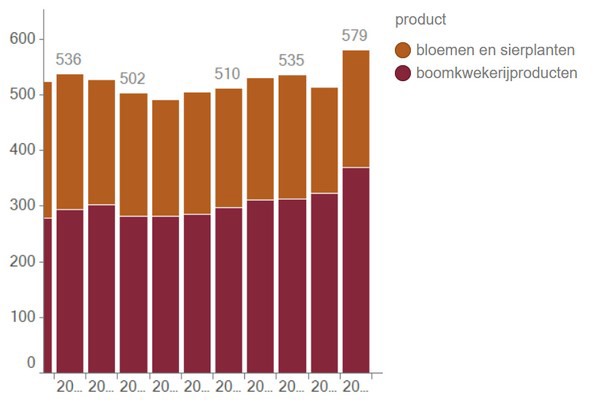 De Vlaamse sierteeltsector is zeer divers en bijgevolg moeilijk te analyseren. De productiewaarde varieert in de periode 2010-2021 tussen 489 en 579 miljoen euro. In 2021 steeg de productiewaarde van 511 miljoen tot 579 miljoen euro, een toename met +13%. De sector herstelde zich na de uitbraak van Corona in 2020.