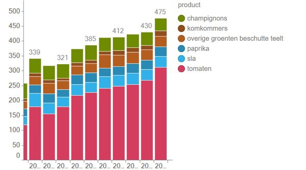 De productiewaarde van groenten onder glas (gerekend in miljoenen)
