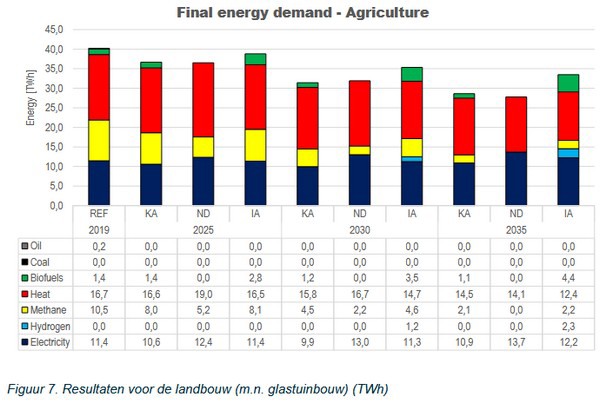 Voor elektriciteit wordt voor het KA scenario de KEV (2022) gevolg met 1,4% krimp tot 2030 en daarna 0,9% groei. Het ND scenario gaat uit van verdere intensivering van de glastuinbouw en komt daarmee uit op een groei van 0,9% in lijn met de KEV (2021) tot 2030. Het IA scenario zit hiertussen in. Verondersteld wordt dat alle scenario’s tussen 2030 en 2035 een lichte groei zien van 0,9% per jaar (KEV, 2022).