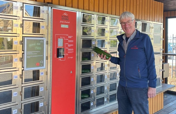 Peter met de eerste komkommers bij de verkoopautomaat SchenkStore. Vroeger teelde hij samen met Jan zelf ook samen komkommers, tot aan 2002. En nu zijn ze terug van weggeweest