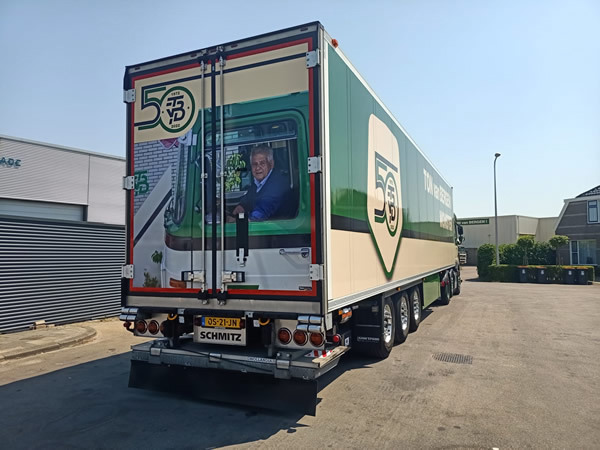 Beide transportondernemers hebben de taken helder verdeeld. “Troy regelt de gehele planning/relatiebeheer en ik doe de rest, van personeel tot wagenpark. Die combinatie vormt voor ons de gouden formule”, vertelt Maurits. “Ton van Bergen zelf heeft tot 31 december 2022 de boekhouding gedaan waarna wij officieel het stokje hebben overgenomen. Ton is nog iedere dag aanwezig en betrokken bij het bedrijf, maar de leiding ligt nu bij ons. Hoe mooi is het dat er momenteel één jubileum-trailer rondrijdt met zijn beeltenis op de achterkant; 50 jaar is tenslotte niet niks.”