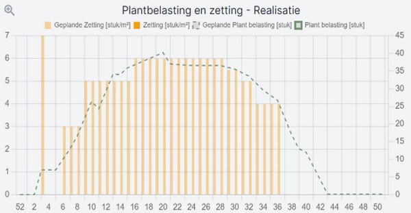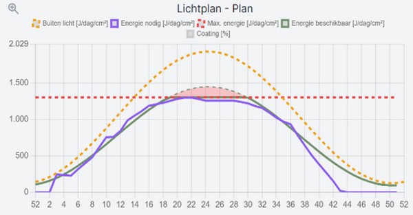 Boven: de lichtplangrafiek en onder: de grafiek van de geplande zetting en plantbelasting. Beide grafieken komen uit ProJoules