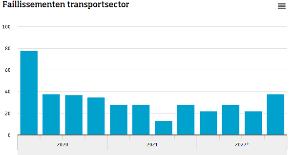 Er gingen in het vierde kwartaal van vorig jaar 38 bedrijven in de transportsector failliet, dat zijn 10 faillissementen meer dan in het laatste kwartaal van 2021. Het is voor het eerst sinds het tweede kwartaal van 2020 dat er meer dan 37 faillissementen zijn in deze sector. Deze stijgende trend is terug te zien bij het aantal faillissementen in andere sectoren.