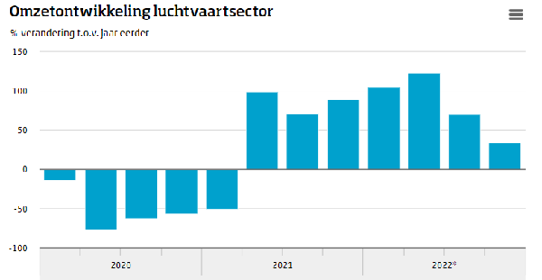 In het vierde kwartaal van 2022 was de omzet van de luchtvaartsector 34,3 procent hoger dan een jaar eerder. In het vierde kwartaal van 2021 waren er nog coronamaatregelen van kracht die een jaar later weggevallen waren waardoor er meer passagiers vervoerd konden worden in vergelijking met een jaar eerder.