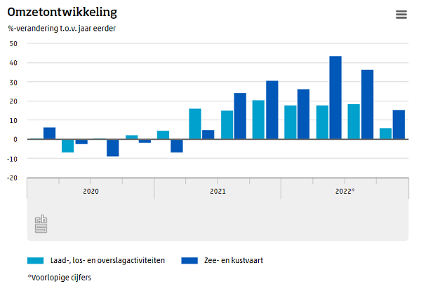 In de laad- en losactiviteiten en zee- en kustvaart is de omzetstijging afgenomen. In het vierde kwartaal van 2022 was de omzet in de laad- en losactiviteiten 5,8 procent hoger dan in hetzelfde kwartaal het jaar daarvoor. In het derde kwartaal was er nog een omzetstijging van 18,6 procent.
