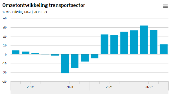 De omzet van de transportsector was in het vierde kwartaal van 2022 11,4 procent hoger dan in dezelfde periode een jaar eerder. In alle deelmarkten was er een omzettoename. De stijging is echter minder groot dan in voorgaande kwartalen. Dit wordt veroorzaakt doordat in meerdere deelmarkten de stijging minder hoog is. Dit meldt het CBS op basis van nieuwe cijfers.
