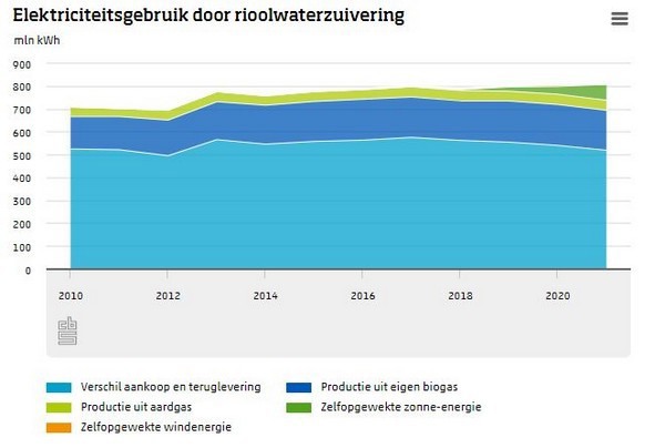 De elektriciteit die in 2021 gebruikt is voor rioolwaterzuivering (810 miljoen kWh), kwam voor 8,5 procent van eigen zonnepanelen, een verdubbeling ten opzichte van 2020. De eigen elektriciteitsproductie uit biogas bedroeg 175 miljoen kWh, ongeveer evenveel als het jaarverbruik van 62 duizend huishoudens. De elektriciteit die in 2021 nog is aangekocht is bijna alleen groene stroom.