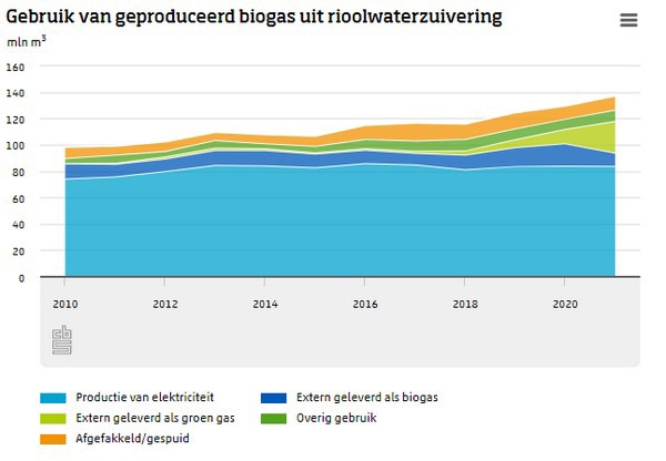 In 2021 produceerden rioolwaterzuiveringsinstallaties ruim 137 miljoen kubieke meter biogas, ruim 15 procent van de landelijke biogasproductie. Dit was de hoogste productie ooit en 6 procent meer dan een jaar eerder. Ruim 60 procent van het biogas werd gebruikt voor elektriciteitsproductie. Nog eens 17 procent van het biogas werd omgezet in groen gas, een ruime verdubbeling ten opzichte van 2020. Groen gas wordt vaak terug geleverd aan het aardgasnet voor gebruik door andere partijen.