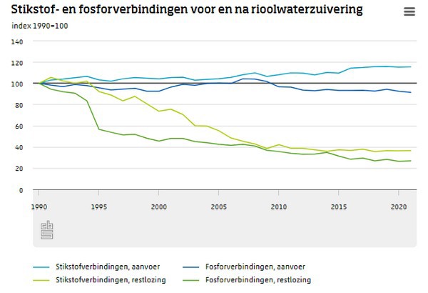 In 2021 zuiverden de rioolwaterzuiveringsinstallaties 1,96 miljard kubieke meter afvalwater, 1,3 procent meer dan in 2020. De installaties verwijderen 98 procent van de biologisch afbreekbare vervuiling uit afvalwater van huishoudens en bedrijven. In 2021 werden 85 procent van de stikstofverbindingen en 87 procent van de fosforverbindingen uit het afvalwater verwijderd, evenveel als in 2020. Doordat de waterzuivering steeds beter gaat is de restlozing van stikstof met 63 procent afgenomen (van ruim 39 miljoen kg naar 14,4 miljoen kg) sinds 1990. De restlozing van fosfor nam zelfs af met 73 procent (van 6,2 miljoen kg naar 1,7 miljoen kg). Hoe goed de meststoffen stikstof en fosfor worden verwijderd is een belangrijke maat voor de prestaties van de rioolwaterzuiveringsinstallaties.