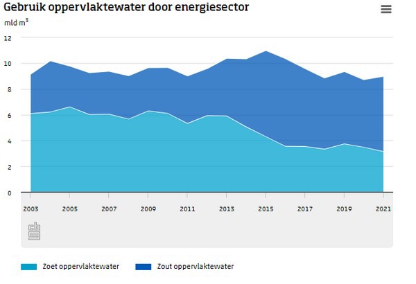 Energiecentrales gebruikten 9,0 miljard kubieke meter koelwater in 2021. Vanaf 2012 is dat koelwater steeds minder vaak zoet. Dit komt door het beleid om nieuwe energiecentrales zoveel mogelijk aan de kust te vestigen, om zo de afhankelijkheid van zoet water te verminderen. In 2012 was het koelwater 62 procent zoet en 38 procent zout, tegen 35 procent zoet en 65 procent zout in 2021.