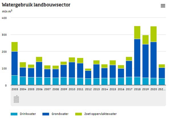 In 2021 gebruikte de landbouwsector 124,4 miljoen kubieke meter water tegen 349,1 miljoen kubieke meter water het jaar ervoor. Dat is een daling van 64,4 procent. Het watergebruik in 2021 was daarmee weer op het niveau van 2017 en eerder. De jaren 2018, 2019 en 2020 hadden relatief droge lentes en zomers. Dit zorgde ervoor dat er meer grondwater en zoet oppervlaktewater is onttrokken voor het irrigeren van de gewassen. Het gebruik van drinkwater bleef in de periode van 2003 tot en met 2021 vrijwel gelijk. Drinkwater wordt vooral ingezet als drinkwater voor vee en schoonmaken van stallen.