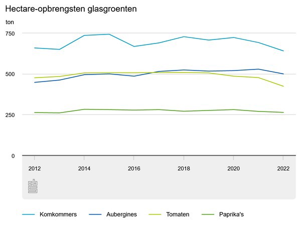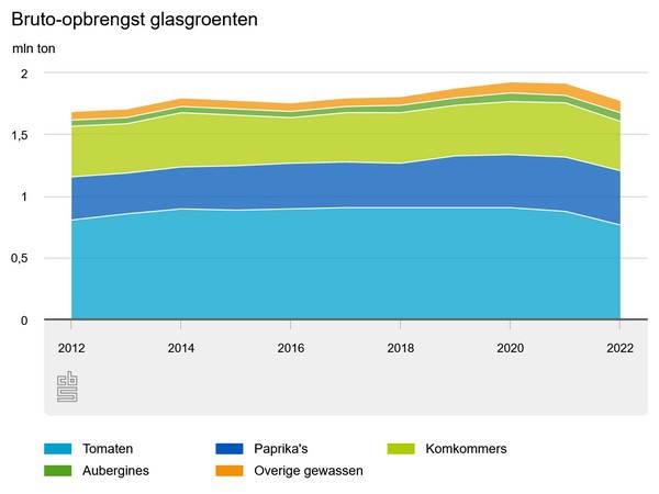 De bruto-opbrengst aan tomaten is in 2022, vergeleken met een jaar geleden, met 110 miljoen kilogram gedaald naar 770 miljoen kilogram. De bruto-opbrengst aan komkommers bedroeg vorig jaar 400 miljoen kilogram, 40 miljoen kilogram minder dan in 2021. Door de hoge energieprijzen is de teelt van deze gewassen later gestart en eerder beëindigd.