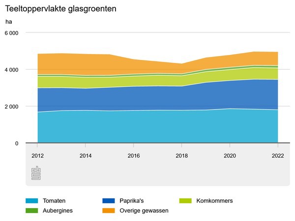 Van de totale teeltoppervlakte glasgroenten was 36,5 procent in 2022 gereserveerd voor de teelt van tomaten, 33,1 procent ging naar de productie van paprika’s. Aubergines namen met 2,7 procent van het areaal glasgroenten veel minder plek in.