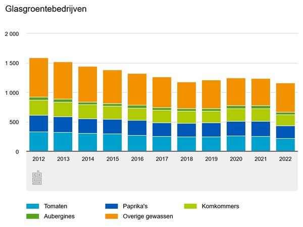 Op 1 april 2022 telde Nederland 1160 glasgroentenbedrijven, 6,4 procent minder dan een jaar eerder. Vergeleken met tien jaar daarvoor is het aantal bedrijven met 433 afgenomen, een daling van 27,2 procent. Vooral het aantal bedrijven dat actief is in de teelt van tomaten is sindsdien gedaald; met 32,6 procent. Maar ook het aantal bedrijven dat komkommers teelt (-26,9 procent) en paprika’s (-25,7 procent) liet tegelijkertijd een daling zien.
