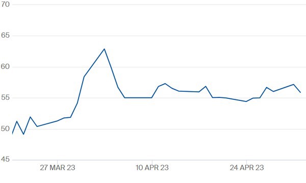 De TTF-gasprijs voor een contract 'winter 2023' ligt woensdagochtend 2 mei op 55,45 euro per megawattuur. Dat is ruim 18 euro hoger dan het contract voor juni 2023. Klik hier voor vergroting en de meest actuele cijfers.