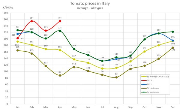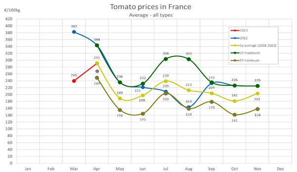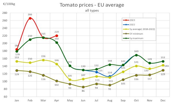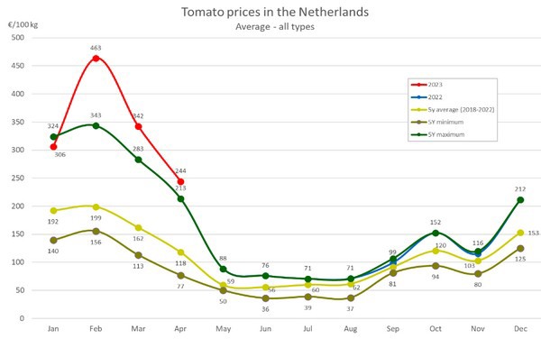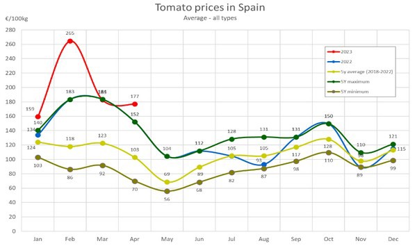 In Spanje zijn ze grillig weer ook wel gewend. De gemiddelde kiloprijs komt in april uit op 1,77 euro. Tegen de trend in stijgt hier de prijs weer. Ondertussen lopen in Zuid-Spanje de producties op zijn einde, al kunnen sommige telers nog wel door tot eind mei/begin juni. Hun tomaten zijn wel steeds meer ingeruild door lokaal product door supermarkten in Noordwest-Europa.