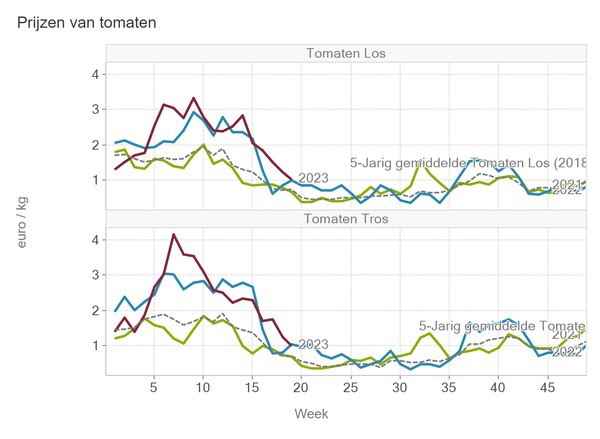 Cijfers vanuit België staan niet in het EU-dashboard. Een update van cijfers van het Verbond van Belgische Tuinbouwcoöperaties over week 19 laat zien dat de prijs hier inmiddels de hoge prijsniveaus van 2022 aantikt. Vanaf week 7 is, met kleine piekjes omhoog, een prijsdaling ingezet.