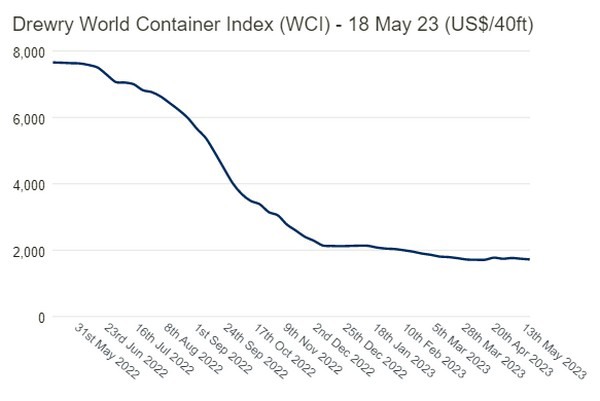 De laatste Drewry WCI samengestelde index van $1.719 per 40-voet container ligt nu 83% onder de piek van $10.377 die in september 2021 werd bereikt. Het is 36% lager dan het 10-jarig gemiddelde van $ 2.688, wat wijst op een terugkeer naar meer normale prijzen, maar blijft 21% hoger dan de gemiddelde 2019 (pre-pandemie) tarieven van $ 1.420.