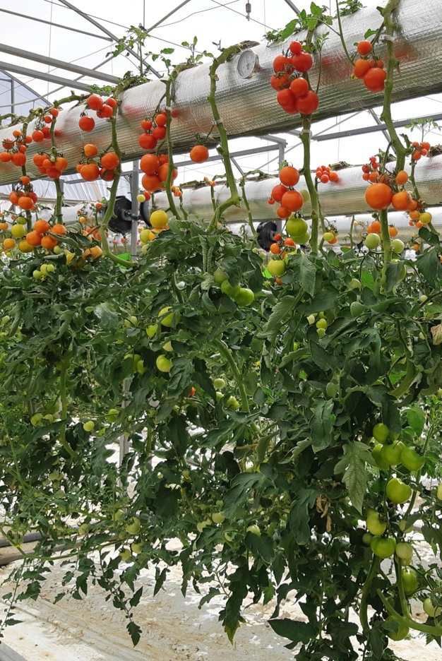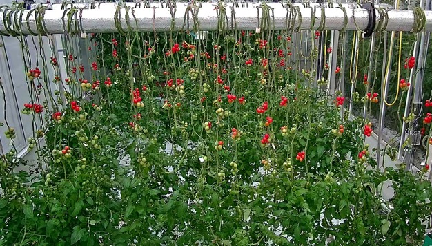 In een proef in het Nederlandse World Horti Center rijpen tomaten aan planten, hangend aan een wat ruim aandoende, stalen buis. Met dit systeem probeert BiomicAgritech niet alleen de arbeidsbehoefte in de kas te verlagen, maar ook te streven naar een volledig geautomatiseerde kas.