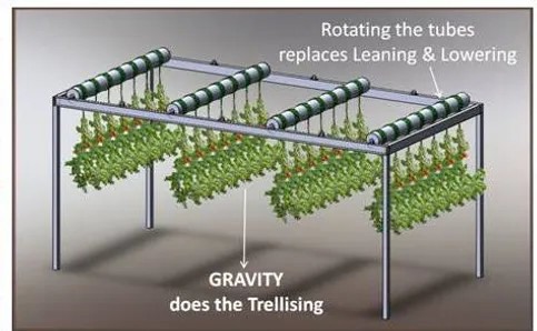 Maar laten we beginnen met het huidige systeem, dat is ontwikkeld door het Israëlische team van BiomicAgritech en bestaat uit groentenplanten die van bovenaf groeien, over draaibare buizen heen. "Het snoeien wordt geëlimineerd door de zwaartekracht en de stengels van de planten worden over de buizen heen gedraaid met een druk op de knop," beschrijft Eliezer.