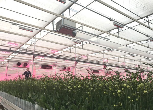 Orchideeën bij CJ Orchids onder stuurbaar LED. Lees hier meer over de installatie.