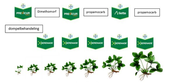 Naast Previcur Energy en Aliette kan Serenade in de opkweek van trayplanten en wachtbedden worden ingezet. De afgelopen jaren heeft Bayer positieve ervaringen opgedaan met Serenade als bladtoepassing toegevoegd aan de middelen in het schema.