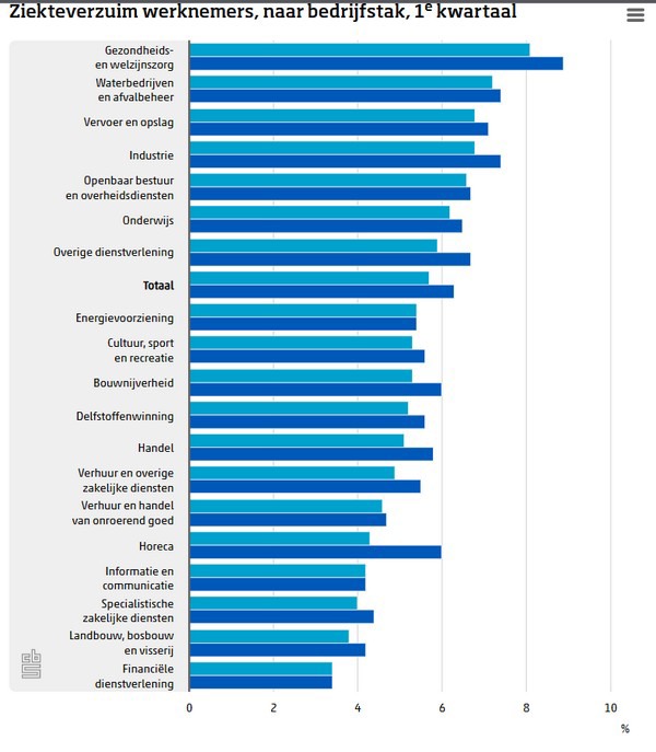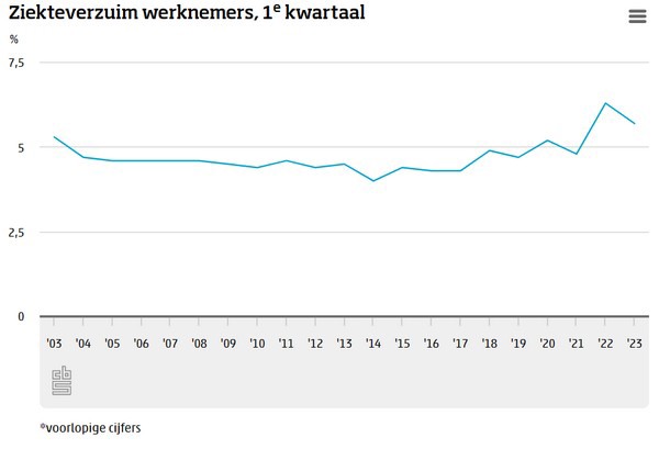 Het ziekteverzuim onder werknemers van bedrijven en overheid was in het eerste kwartaal van 2023 5,7 procent. Hoewel dit percentage lager is dan het hoogtepunt van 6,3 procent in dezelfde periode in 2022, is het ziekteverzuim vergeleken met de voorgaande jaren nog steeds hoger. Dat blijkt uit nieuwe cijfers van het CBS.