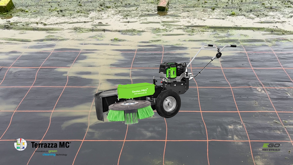 De vorige Terrazza GEOTEX-Pro is al jarne in gebruik in de sector en wordt gebruikt door telers van planten, bomen, groenten en fruit, voor het ecologisch en eenvoudig reinigen van hun geotextiel of kunststof folie (HDPA). De machine staat internationaal bekend om de gepatenteerde Terrazza MC-technologie, die op effectieve wijze onkruid, mos en algen verwijdert zonder dat er chemicaliën nodig zijn. Met de toevoeging van de elektrische motor van EGO zal de machine nog betere ecologische prestaties leveren.