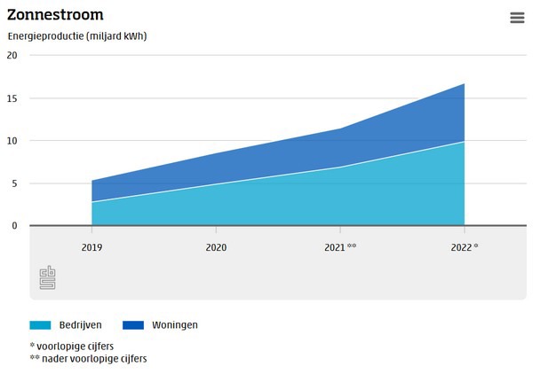 De energieproductie uit zonnestroom is in 2022 gegroeid naar 16,8 miljard kilowattuur (kWh). Bijna 60 procent van deze productie komt van zonnepanelen bij bedrijven. De rest komt van zonnepanelen op daken van woningen. Sinds 2019 is het opgestelde vermogen, oftewel de capaciteit, van zonnepanelen bij bedrijven groter dan bij woningen, vooral omdat er grote zonneparken bij zijn gekomen. In 2022 steeg de energieproductie van woningen wel iets meer (+49 procent) dan bij bedrijven (+45 procent).