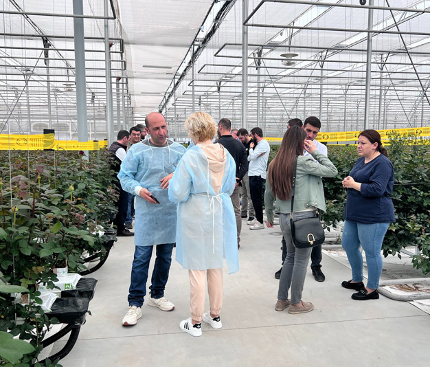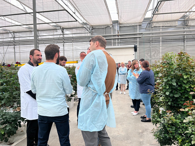 De tweede kas die werd bezocht was Gevmik LLC, een rozenkas van 4 hectare, ook voorzien van de nieuwste technologieën, waaronder een druppelirrigatiesysteem, warmteopslagtank en CO2-injectiesysteem, mist- en schermsystemen onder hoge druk, enzovoort. De deelnemers waren onder de indruk van het niveau van verfijning en innovatie in de kas, waarmee de telers efficiënter rozen van hoge kwaliteit kunnen kweken.